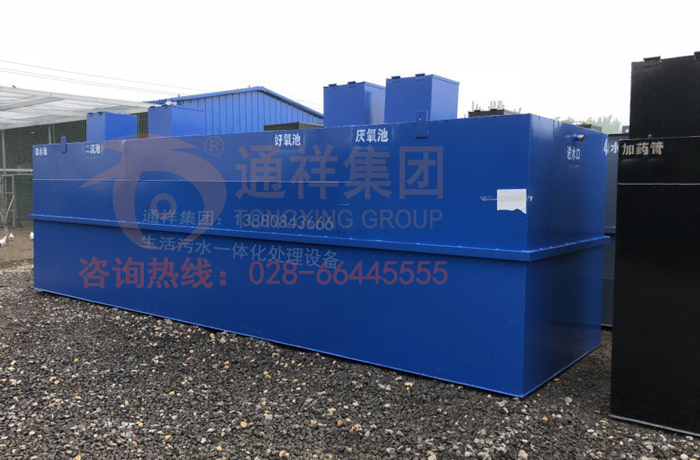 本着投资少、效益高,优先采用适合我国国情的最佳使用技术的原则,四川通祥机械设备集团有限公司根据目前国内同类生活污水处理技术的现状,在综合考察各种废水治理技术的基础上,结合本项目的实际,拟采用“化粪池+格栅+调节池+缺氧池+生物接触氧化+MBR+二氧化氯消毒”工艺进行污水处理,MBR几乎不需要排泥,通过回流即可维持永久性运行。具体流程为:污水收集汇入化粪池,出水经格栅去除其中较大的杂质和漂浮物,再经调节池调节水量水质后进入缺氧池,去除大分子有机物,同时提高污水可生化性。在缺氧池进行反硝化,通过硝化液的回流,去除污水中的总氮,并提高氨氮的去除率。缺氧池出水进入接触氧化池,内设填料,增加污水与好氧微生物的接触面积,使污水中的有机物等大幅降低。经好氧处理后的污水自流进入MBR池,mbr膜池内置污泥,通过曝气维持污泥活性,进一步去除有机物,并过滤澄清水质。MBR膜池的水通过自吸泵提升至消毒池,经二氧化氯发生器消毒后进入清水池,清水池储存的清水达标排放。清水池的水可以对MBR膜进行反冲洗,通祥集团医院污水处理设备具体工艺流程图如下: